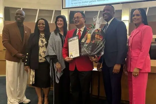 Audley Rollen (center) with the Mayor of Tamarac and City Commissioners.